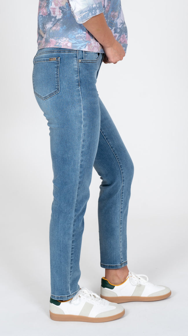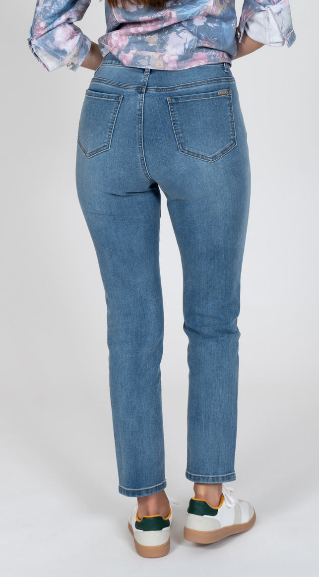 CONSTRUCTED FIVE POCKET WESTERN JEANS IN MEDIUM STONEWASH.