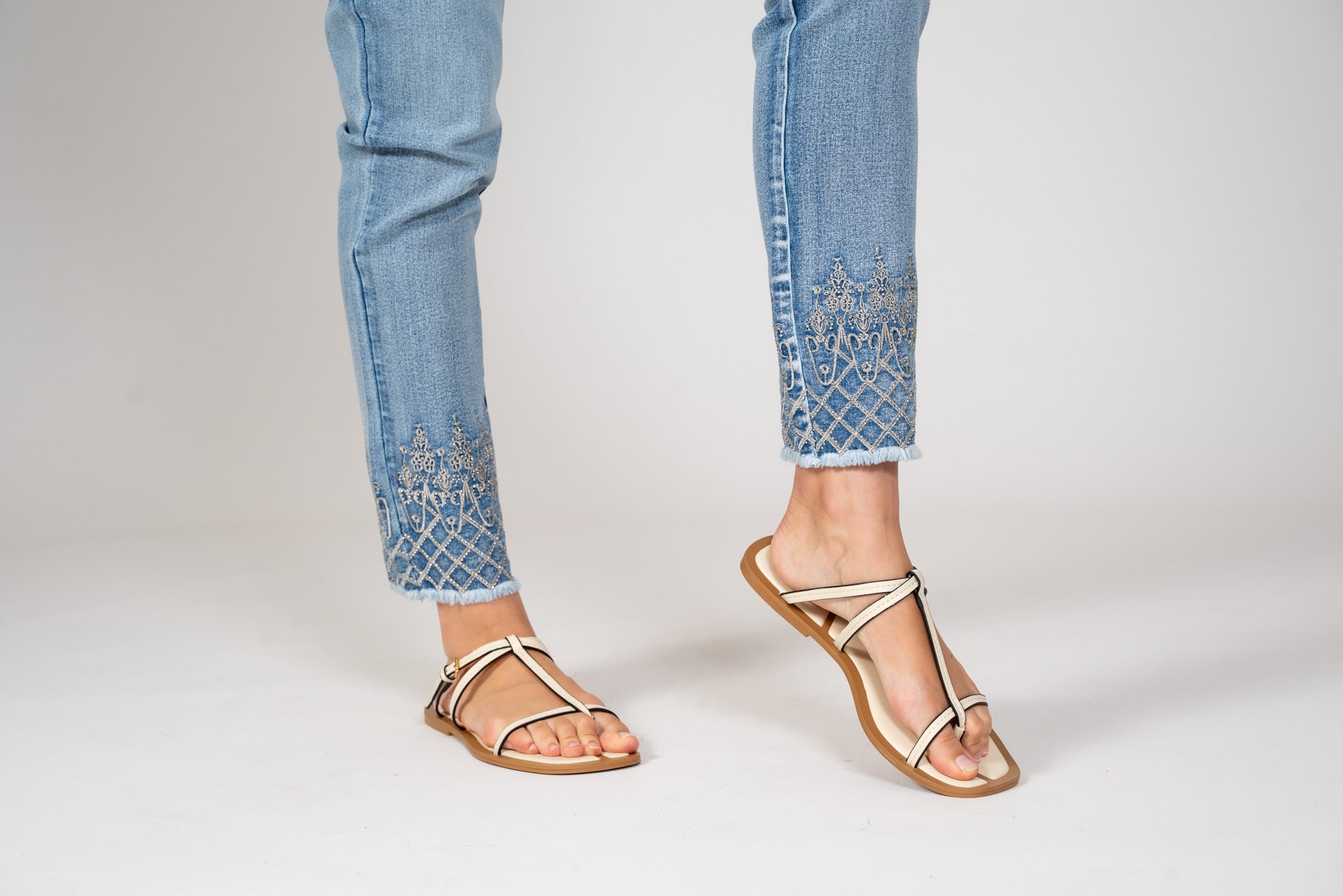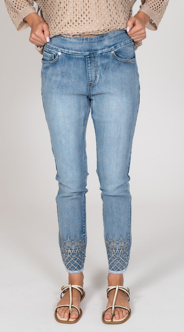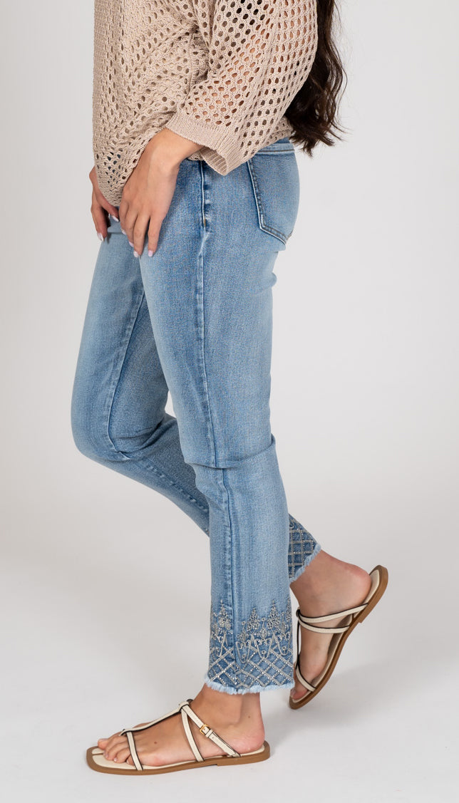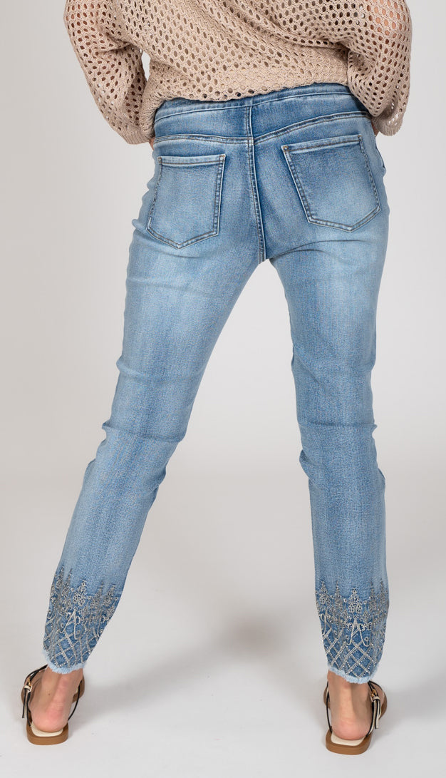 DENIM COMFORT WAISTBAND JEAN WITH BEAUTIFUL EMBELISHED DETAILS ABOVE THE CUFF. COMES WITH A FREY BOTTOM CUFF. GREAT WASH WITH A SLIGHT FRONT AND BACK SANDBLASTING