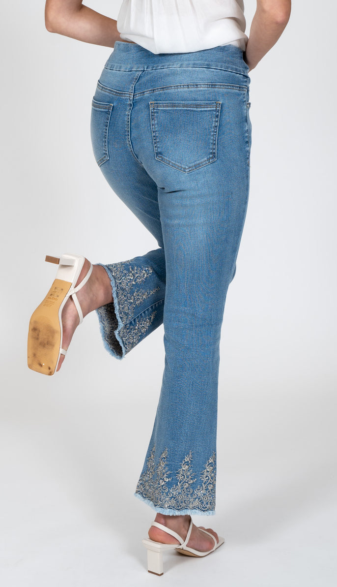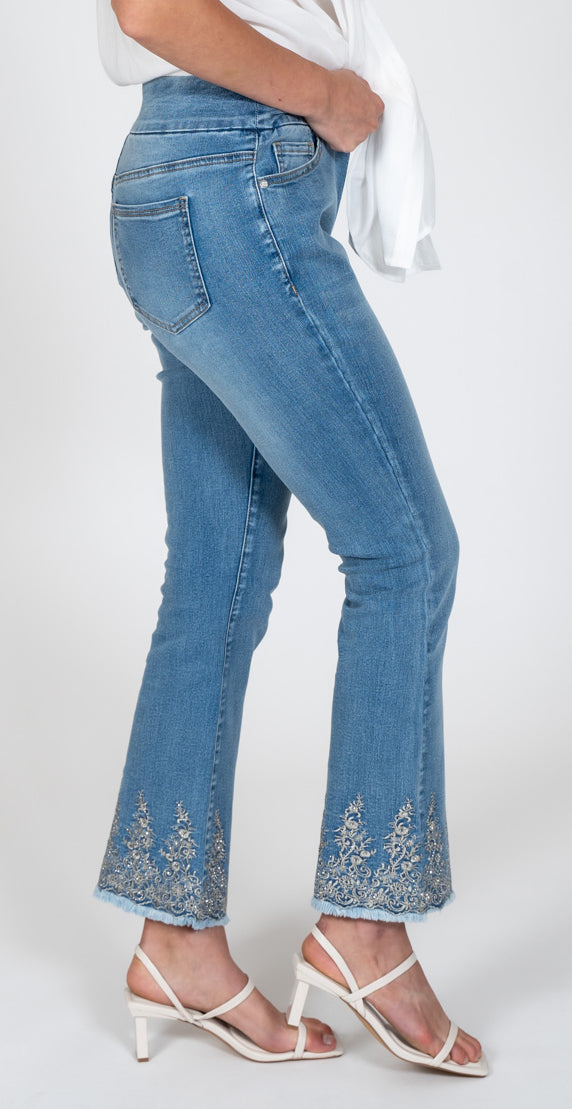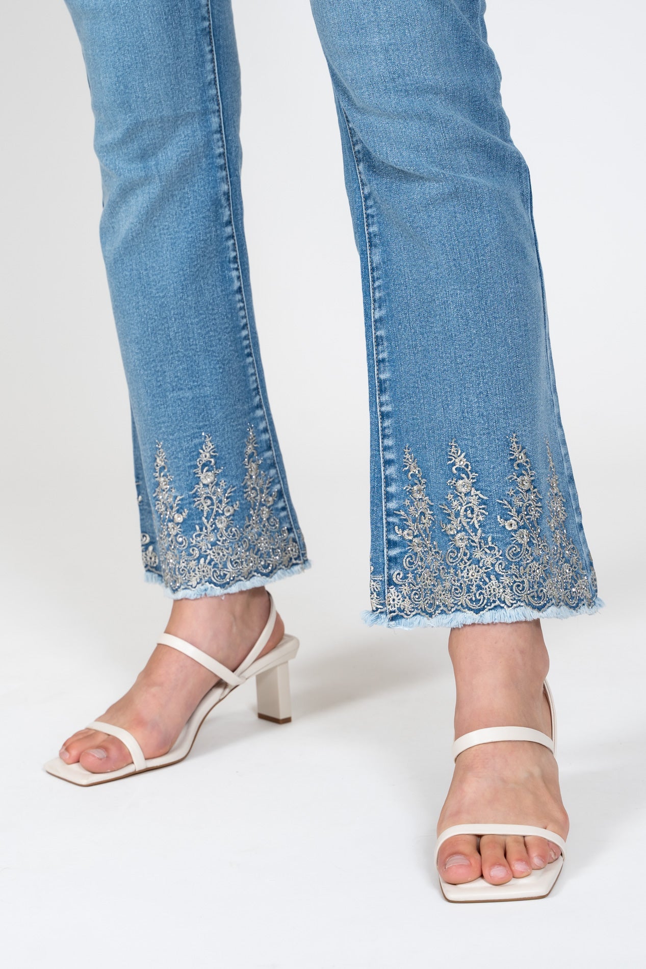 COMFORT WAISTBAND DENIM JEAN WITH FLAIR BOTTOM AND BEAUTIFUL EMBELISHED RHINESTONE DTAILS.