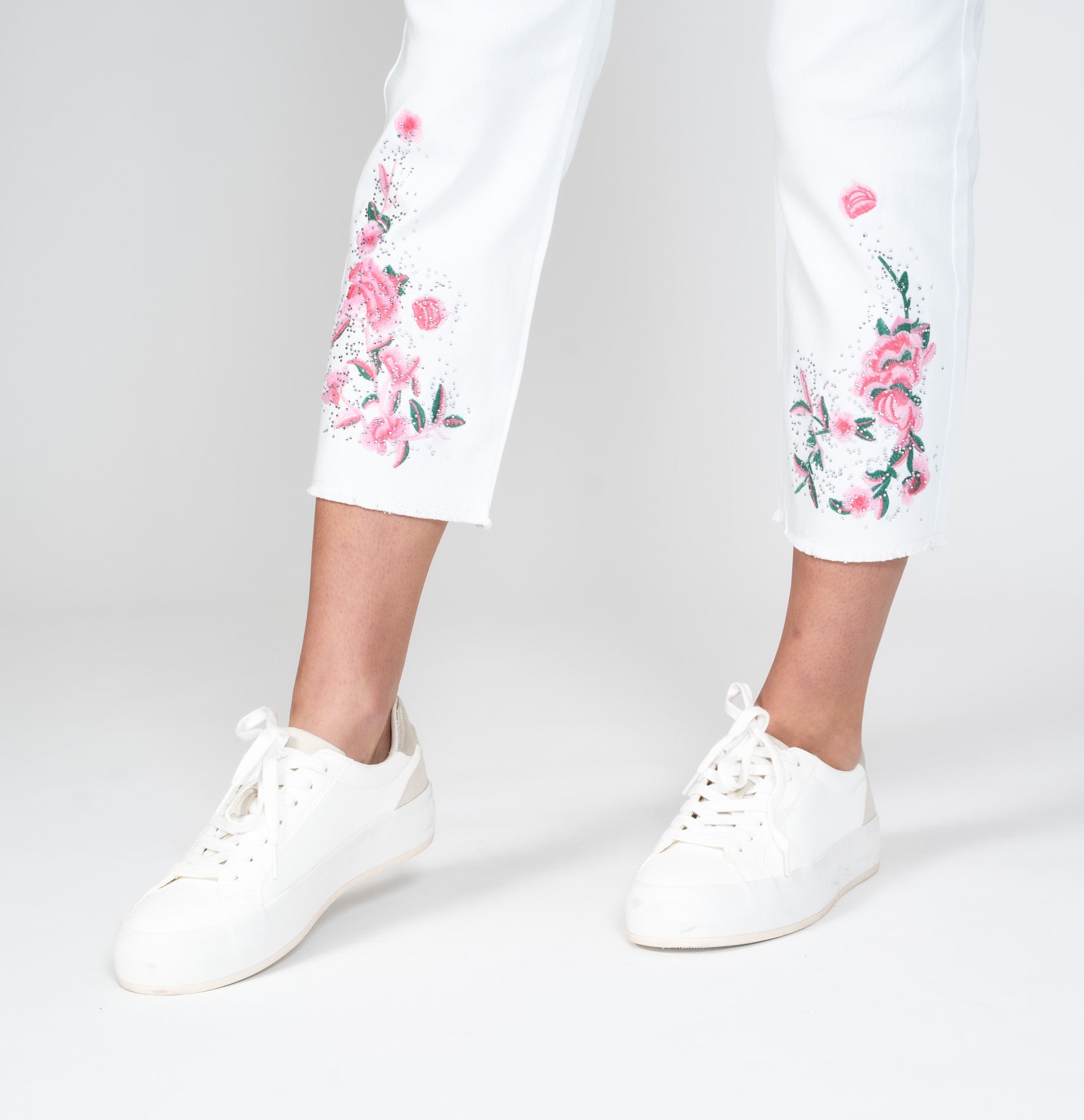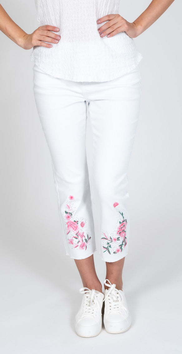 WHITE STRETCH DENIM CAPRI. FULLY CONSTRUCTED PANT WITH FRONT ZIPPER AND SHANK BUTTON. THE PANT IS EMBELISHED WITH A BEAUTIFUL EMBROIDERY AND ADDED BLING